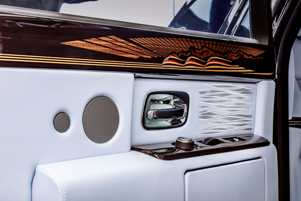 Phantom modellerinin üretimi boyunca güzelce kullanılan kakmacılık sanatı, bu özel müşterinin 1930’ların tasarım ve ikonografi büyüsü hayranlığını yansıtarak çağın transatlantik gemilerini eşsiz bir şekilde tasvirliyor. Bu denizcilik teması, eşsiz bir şekilde aracın iç kısmında Powder Blue deri üzerine uygulanmış ton üzerine ton işlemeciliği ile denizin hareketini anımsatacak şekilde devam ediyor.